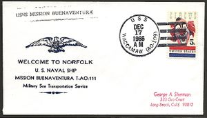 This section lists active links to the pages displaying covers associated with the ship. There should be a separate set of pages for each name of the ship (for example, Bushnell AG-32 / Sumner AGS-5 are different names for the same ship so there should be one set of pages for Bushnell and one set for Sumner). Covers should be presented in chronological order (or as best as can be determined).