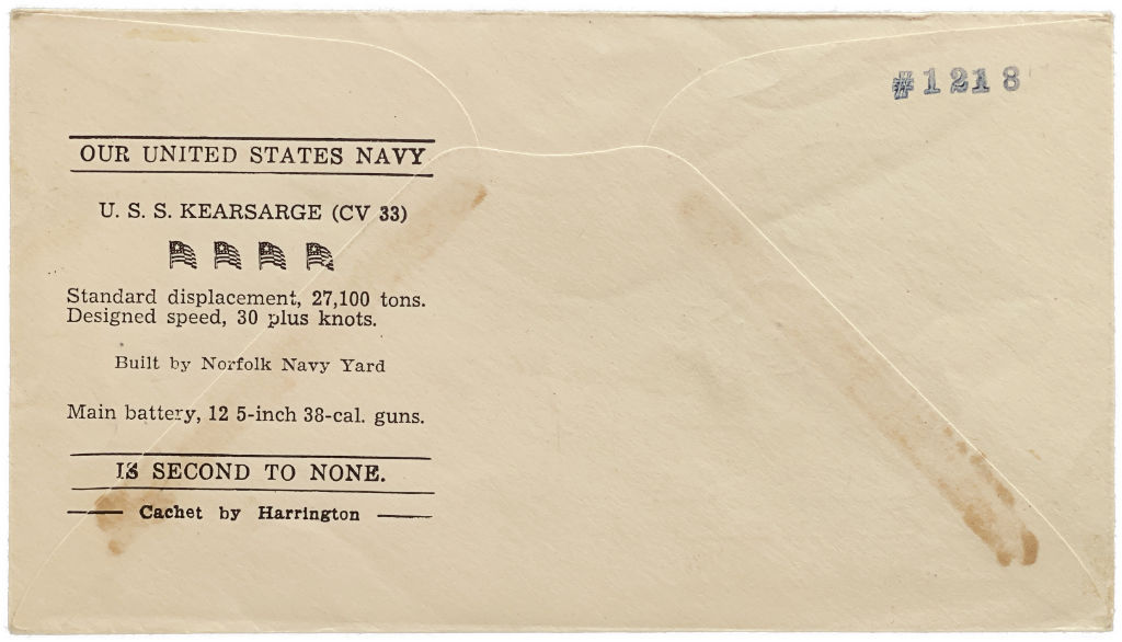 Our United States Navy U.S.S. Kearsarge (CV 33) Standard displacement, 27,100 tons. Designed speed, 30 plus knots. Built by Norfolk Navy Yard Main battery, 12 5-inch 38-cal. guns Is Second To None Cachet by Harrington