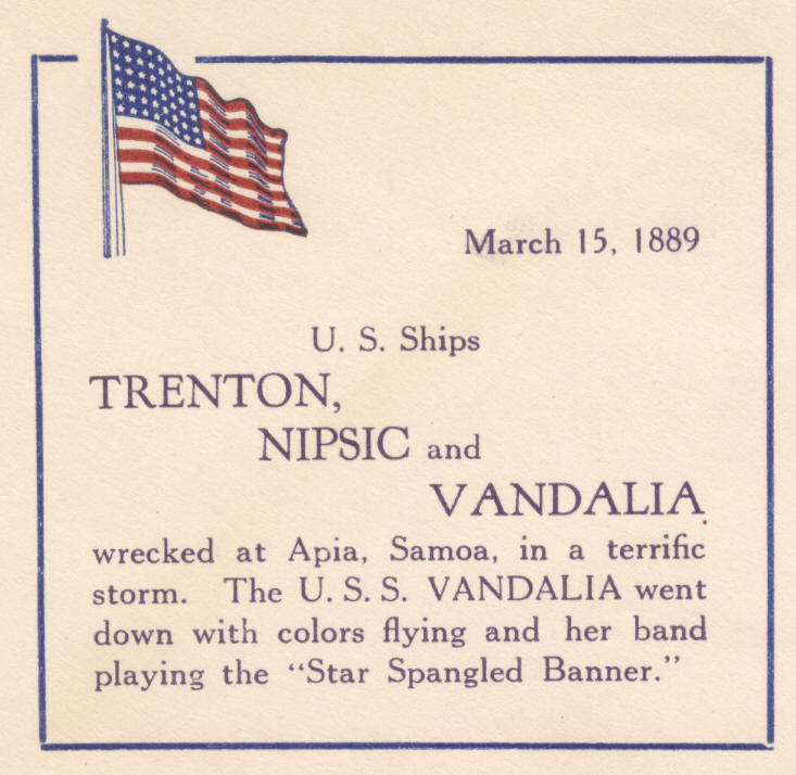 Closeup of cachet by unknown maker commemorating the loss of Trenton, Nipsic, and Vandalia in 1889