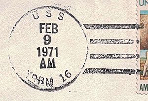 This section lists examples of the postmarks used by the ship. There should be a separate set of postmarks for each name and/or commissioning period. Within each set, the postmarks should be listed in order of their classification type. If more than one postmark has the same classification, then they should be further sorted by date of earliest known usage.