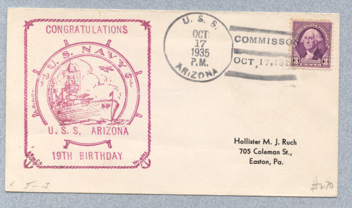 Front of cover from USS Arizona BB-39 with postmark type 3 (B-BBT)