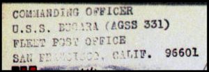 This section lists examples of the postmarks used by the ship. There should be a separate set of postmarks for each incarnation of the ship (ie, for each entry in the "Ship Name and Designation History" section). Within each set, the postmarks should be listed in order of their classification type. If more than one postmark has the same classification, then they should be further sorted by date of earliest known usage.
