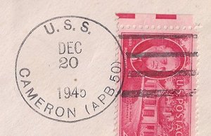 This section lists examples of the postmarks used by the ship. There should be a separate set of postmarks for each name and/or commissioning period. Within each set, the postmarks should be listed in order of their classification type. If more than one postmark has the same classification, then they should be further sorted by date of earliest known usage.