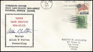 This section lists active links to the pages displaying covers associated with the ship. There should be a separate set of pages for each name of the ship (for example, Bushnell AG-32 / Sumner AGS-5 are different names for the same ship so there should be one set of pages for Bushnell and one set for Sumner). Covers should be presented in chronological order (or as best as can be determined).