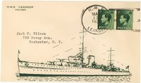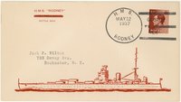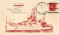 4. The Hobby Shop also produced fake postmarks with Type CD-3 postmarks for several British ships. Although the postmarks are dated May 12, 1937 (coronation day of King George VI), they were undoubtedly created in 1941 along with the other Hobby Shop fakes. The ships include HMS COURAGEOUS, GLASGOW (misspelled GLASCOW), GLORIOUS, HOOD, LEANDER, RENOWN, REPULSE, RESOLUTION, REVENGE, RODNEY, SOUTHAMPTON and VALIANT. The cachet is a large line drawing of the ship which covers most of the bottom half of the envelope, with the ship's name printed in the upper left comer. The postmark on the HMS HOOD cover is different from the others, being a larger marking with four long killer bars.
