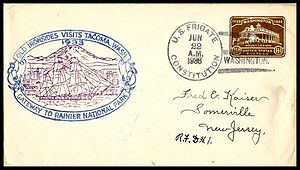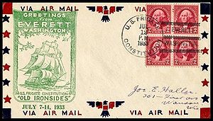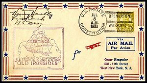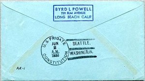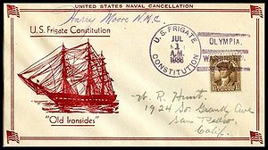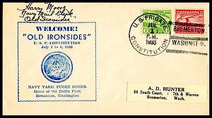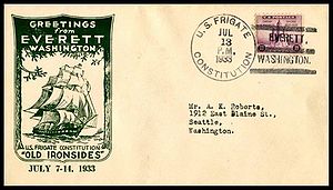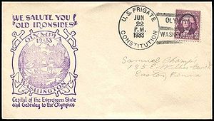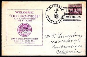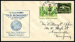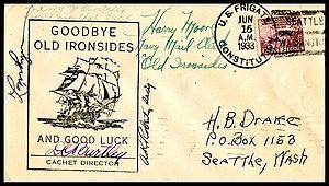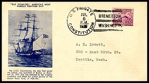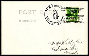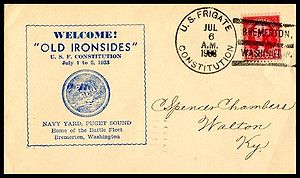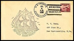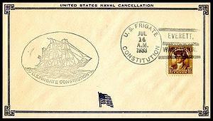 Printed cachet – “Old Ironsides, America’s Most Famous Fighting Ship”. Rubber stamp cachet on back.