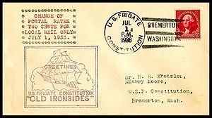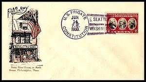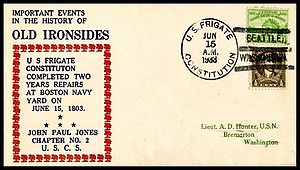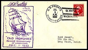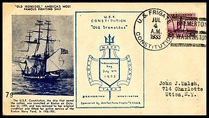 Printed cachet “Old Ironsides, America’s Most Famous Fighting Ship”. Rubber stamp Independence Day cachet by the John Paul Jones Chapter No. 2, USCS added.