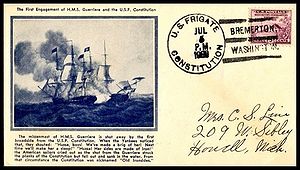 Printed cachet – “The First Engagement of HMS Guerrierre and the USF Constitution”. Rubber stamp cachet on back.