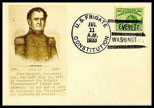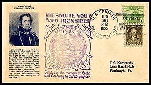 Printed cachet showing Commodore Stephen Decatur. Rubber stamp visit cachet added.