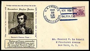 Printed cachet – Commodore Stephen Decatur. Ships cachet on the back.