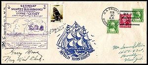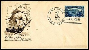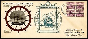 Double cachet from the USS Relief AH-1 Saluting the USF Constitution on the Anniversary of her battle with HMS Levant and Cyane. Cachet by Clyde G. Morris.