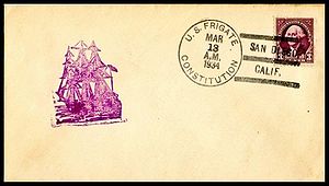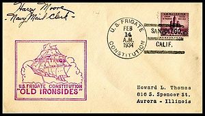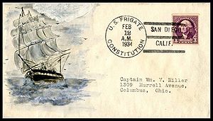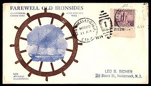 Stamped cachet from the USS Relief AH-1 Saluting the USF Constitution on the Anniversary of her battle with HMS Levant and Cyane. Cachet by Clyde G. Morris.