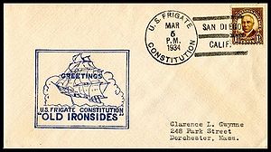 On the back is a 1947 USS Constitution stamp with a Locy Type 7dit(1) / "BOSTON, MASS." , (First Day of Issue) postmark from Oct. 21 1947.