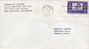 This section lists active links to the pages displaying covers associated with the ship. There should be a separate set of pages for each name of the ship (for example, Bushnell AG-32 / Sumner AGS-5 are different names for the same ship so there should be one set of pages for Bushnell and one set for Sumner). Covers should be presented in chronological order (or as best as can be determined).