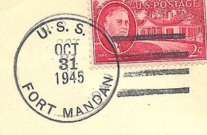 USS FORT MANDAN received the following awards during her US Navy career - Navy Meritorious Unit Commendation - American Campaign Medal - World War II Victory Medal - Navy Occupation Service Medal (with Europe clasp) - National Defense Service Medal.
