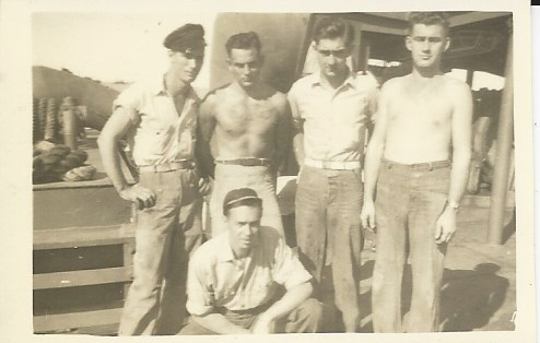 File:ROSudduth 1945-five crew members aboard USS Raccoon.jpg