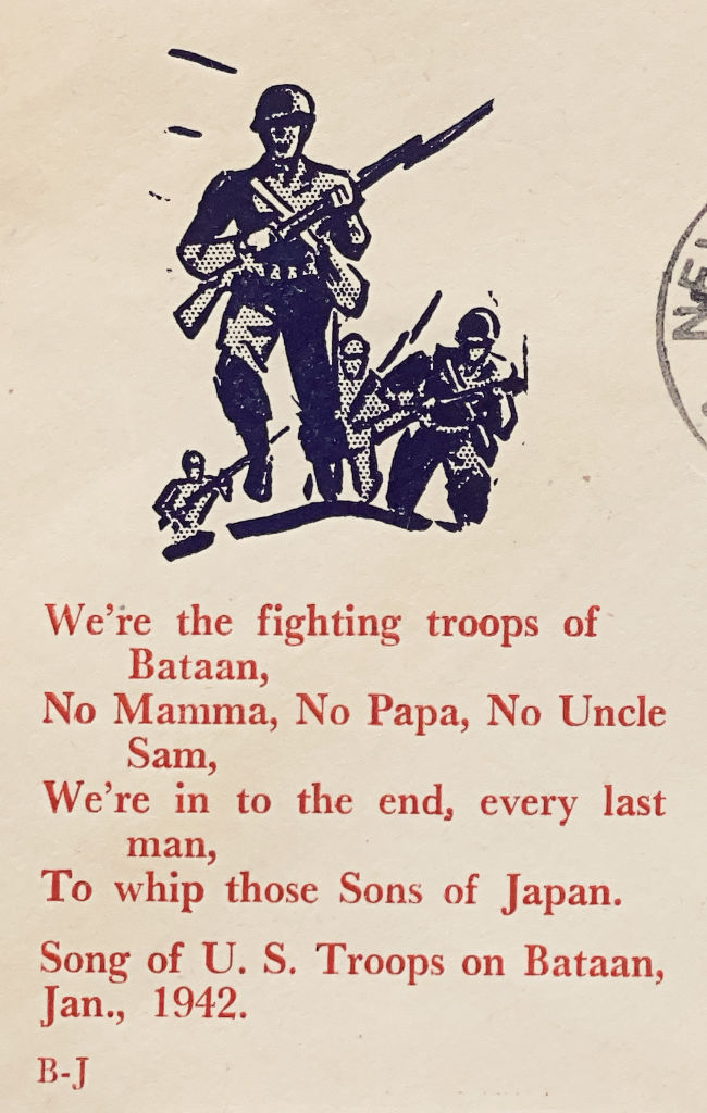 We're the fighting troops of Bataan, No Mamma, No Papa, No Uncle Sam, We're in to the end, every last man, To whip those Sons of Japan. Song of U.S. Troops on Bataan, Jan., 1942 B-J