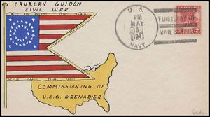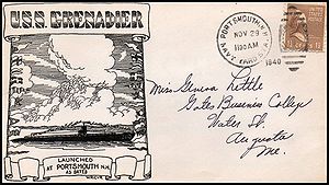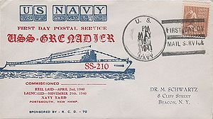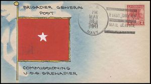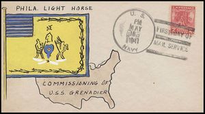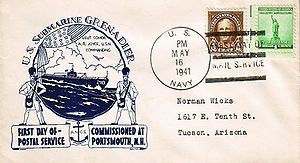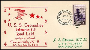 Cachet commemorates commissioning of submarines since the previous Navy Day: USS Trout SS-202, USS Tuna SS-203, USS Mackerel SS-204, USS Marlin SS-205, USS Gar SS-206, USS Grampus SS-207, USS Grayback SS-208, USS Grayling SS-209, USS Grenadier SS-210 and USS Gudgeon SS-211.