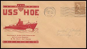 Commissioning, cachet by William S. Linto. Postmark from the Atlantic Fleet Service School, Virginia Beach VA