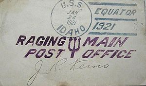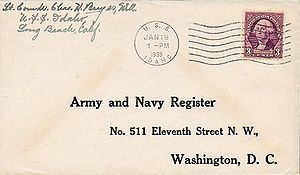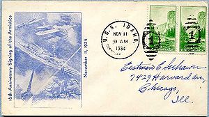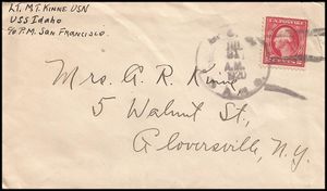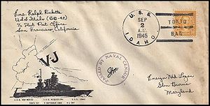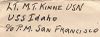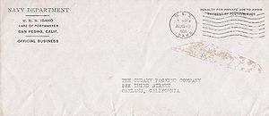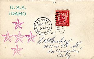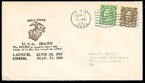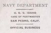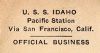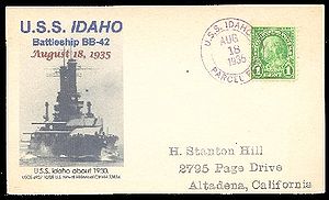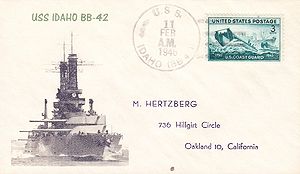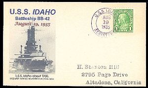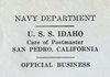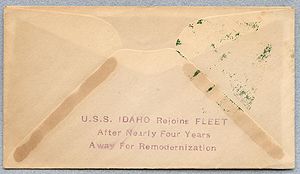 Cachet on the back of the cover commemorates the return of USS Idaho to the fleet (return to San Pedro home port) after modernization.