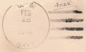 This section lists examples of the postmarks used by the ship. There should be a separate set of postmarks for each name and/or commissioning period. Within each set, the postmarks should be listed in order of their classification type. If more than one postmark has the same classification, then they should be further sorted by date of earliest known usage.