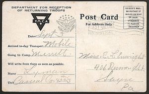 YMCA "Returning Home" card. The ship had no postal facilities.