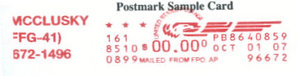 This section lists examples of the postmarks used by the ship. There should be a separate set of postmarks for each incarnation of the ship (ie, for each entry in the "Ship Name and Designation History" section). Within each set, the postmarks should be listed in order of their classification type. If more than one postmark has the same classification, then they should be further sorted by date of earliest known usage.