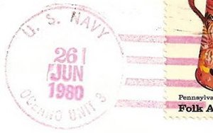 This section lists examples of the postmarks used by the ship. There should be a separate set of postmarks for each name and/or commissioning period. Within each set, the postmarks should be listed in order of their classification type. If more than one postmark has the same classification, then they should be further sorted by date of earliest known usage.