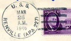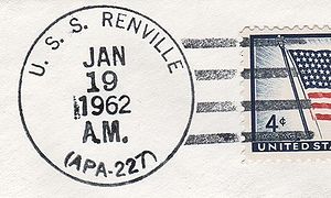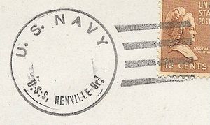 USS RENVILLE earned the China Service Medal, the American Campaign Medal, the Asiatic-Pacific Campaign Medal w/ 1 Battle star, the World War II Victory Medal, the Navy Occupation Service Medal w/ with Asia clasp, the National Defense Service Medal w/ 2 bronze stars, the Korean Service Medal w/ 2 Battle stars, Armed Forces Service Medal w/ 2 bronze stars, the Vietnam Service Medal w/ 3 Battle stars, the Republic of Vietnam Gallantry Cross Unit Citation Ribbon, the Philippines Liberation Medal, the Republic of Vietnam Campaign Medal and the Republic of Korea War Service Medal during her naval career.