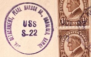 "Figure S-75 is a standard Type 5hks cancel for the Submarine Detachment at Pearl Harbor; the mail clerk used wording similar to that shown for several boats there. The exact