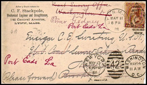 The piece was mailed from Lynn Massachusetts to the USC&GS Schooner READY. Rerouted to the Coast Survey Office, Washington DC. Postmarked from New York (Duplex #42) on May 13 1886, to Washington DC on May 14 1886. Ensign Sweeting had been reassigned to the USC&GS Schooner THOMAS R. GEDNEY and this cover was forwarded to Port Eads, Louisiana. Postmarks on the back show it reached Port Eads on May 19 1886. Two other readable postmarks from Washington DC; "Box Department 4" and "Washington Rec'd 1" are both dated May 14th 1886.