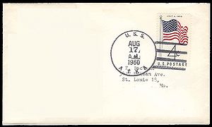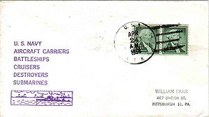 Black rubber stamp cachet. Return address from the ship's CO, Cmdr. Buster E. Toon, USN