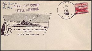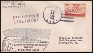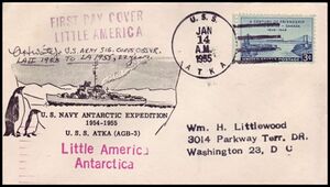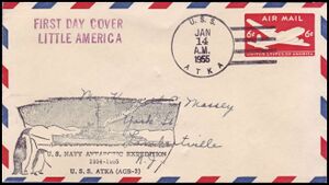 Printed OSC / 1955 Antarctic Expedition with ship’s 2L marking - "FIRST DAY COVER / LITTLE AMERICA" and 2L marking - "Little America/ Antarctica" posted aboard ATKA on 14 JAN 1955 with signature of A.H. Waite, U.S. Army Signal Corps. He was an observer on this cruise. From the John Young collection.