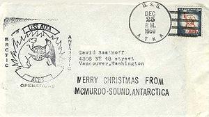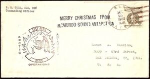Stamped OSC / 1955 Antarctic Expedition & ship’s 2L marking - "FIRST DAY COVER / LITTLE AMERICA" along with icebreaker’s corner card (return address stamp). From the John Young collection.