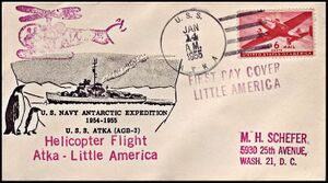 Printed OSC/ 1955 Antarctic Expedition franked with 6 cents airmail stamp has “helicopter” cachet, 2L marking - "Helicopter Flight / Atka- Little America", ship’s 2L marking - "FIRST DAY COVER / LITTLE AMERICA". From the John Young collection.