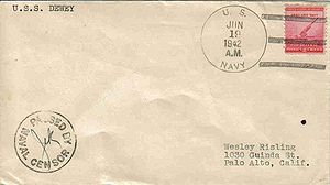Censored, WWII use. Front typed notation "U.S.S. DEWEY". Back blue rubberstamp D.C. Bartley return...Black rubberstamp "793135"...Pencil notation "25002"