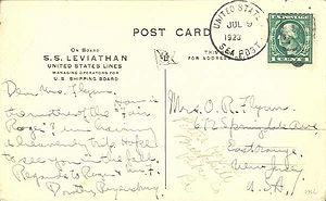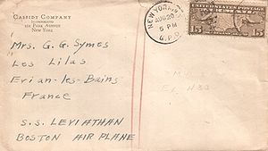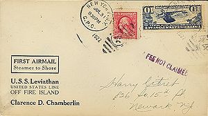 Black rubberstamp "AIRMAIL FLIGHT FAILED TO / S.S. LEVIATHAN"