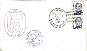 Front violet rubberstamp ship's crest. Back USPS routing marks (K4,M6)...Blue rubberstamp "NOV 9 1987"
