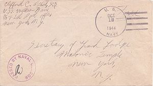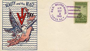Note: "The device from which this postmark was produced was later obtained by a cover dealer and used to produce hundreds of fake covers. Genuine covers are censored, postally used, with a mimeograph cachet and either sent free or with a 6¢ airmail stamp. Fake covers usually have 3¢ commemorative stamps, colored printed cachets, and no address or censor mark. Covers with the 9efu and "TOKYO/BAY" or "NAVY/DAY" as killers are also believed to be fake products of the same dealer." (USCS Postmark Catalog, 1997)